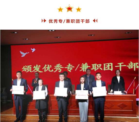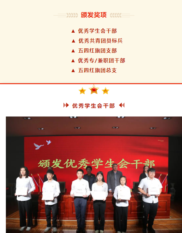 会上,党办主任张志平老师宣读了2022-2023年度五四表彰名单。分别是: “五四红旗团总支”、“五四红旗团支部”、“优秀专/兼职团干部(教师)”、“优秀团干部(学生)”、“优秀共青团员”、“优秀共青团员”、“优秀共青团员标兵”、“优秀系学生会干部”、“优秀院学生会干部”。