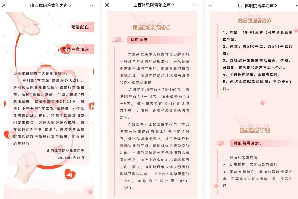 为做好此次无偿献血活动的宣传和动员工作,院团委、学生会提前下发了无偿献血倡议书,宣传献血知识,讲述献血前、后的注意事项,以减轻同学们对献血的陌生和恐惧。