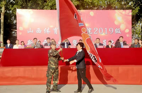 最后,院党委书记陈洁向主训教官廉冰授旗。至此,我院2019级新生开学典礼暨军训动员大会圆满结束。