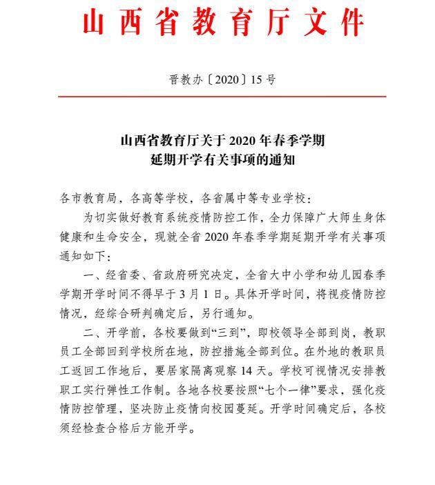 山西省教育厅关于2020年春季学期延期开学有关事项的通知