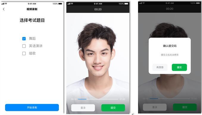 视频录制,选择考题开始录制,未提交前可重复录制,确认提交后无法修改。