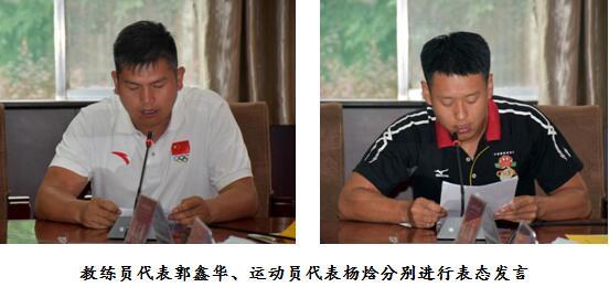 学院承担全运会金牌任务的橄榄球队运动员杨焓、教练员郭鑫华分别代表运动员和教练员就反兴奋剂工作进行承诺表态发言。