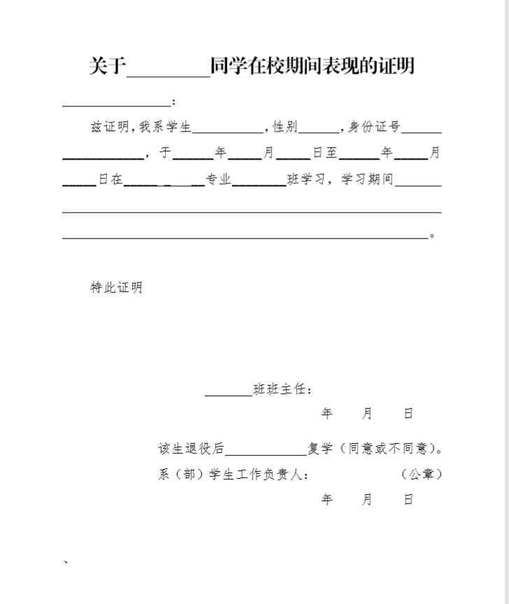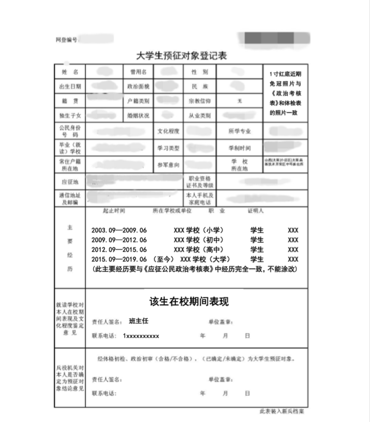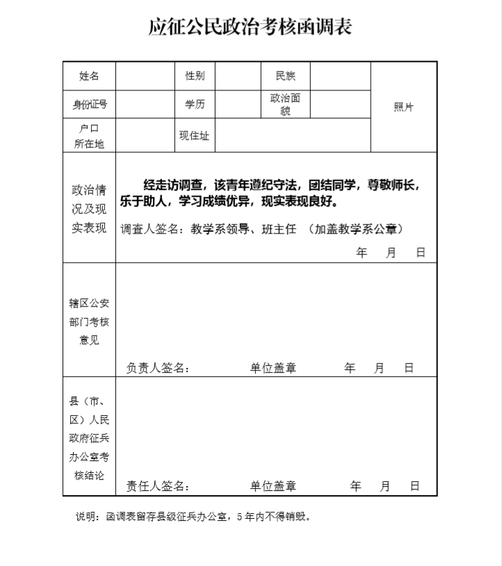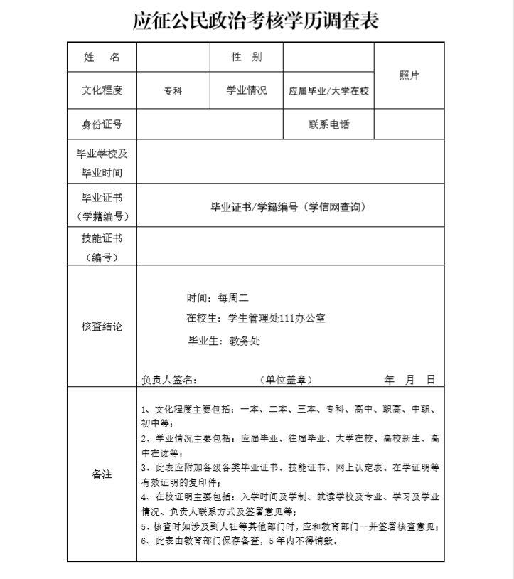 2. 从户籍所在地入伍学生需返校办理《应征公民政治考核函调表》和《应征公民政治考核学历调查表》有关事宜;