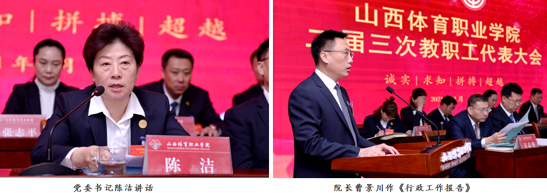 院党委书记陈洁作了讲话。她代表党委对大会的圆满成功表示祝贺,向各位代表和全体师生员工的辛勤努力表示感谢。她指出,在全党全面开展党史学习教育之际,学院召开二届三次教代会,对行政工作报告、工会工作报告、财务工作报告和学院“十四五”规划编制情况进行了深入讨论,形成了许多真知灼见。会议开得很成功,是一次统一思想、深化新发展理念的大会,是一次谋划未来、明确新目标和新要求的大会,更是一次凝聚人心、汇聚力量、激扬干劲的大会!