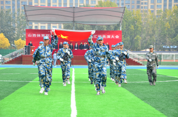 军训汇演在庄严的升旗仪式中拉开帷幕,在雄壮的国歌声中,五星红旗缓缓升起,全体人员庄严肃立,面向国旗行注目礼。陈洁、岳建民、何洋在军训总教官的陪同下检阅了受训学生。全体受训学生展示了11天的训练成果,在军训教官铿锵有力的口令声中,组成方队依次进行了分列式、挎枪方阵、队列表演、刺杀操、应急棍术、基础战术、擒敌拳、国风手势舞等八个项目的表演,整齐划一的队形、嘹亮高昂的口号,彰显了体院学子积极向上、拼搏进取的精神风貌。
