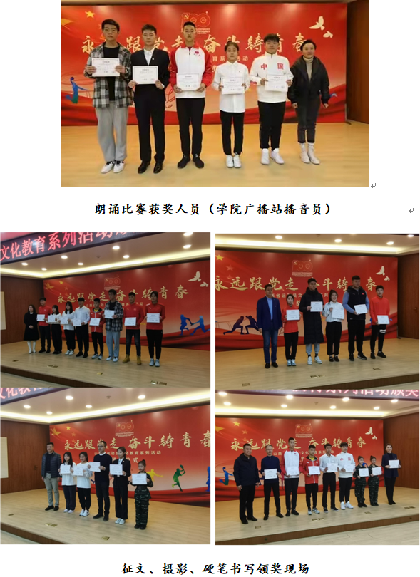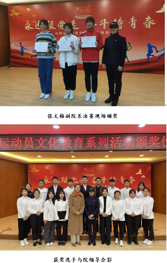 为丰富运动员文化生活,树立运动员爱党、爱国思想,山西省体育局自2021年11月26日至12月1日举办“永远跟党走 奋斗铸青春”运动员文化教育系列活动。为圆满完成本次活动的参赛工作,由训练处牵头、院团委配合经过精心的组织和选拔,在学院各教学系部的大力支持下,共有近120名同学报名参加硬笔书写、朗诵、摄影和征文全部四项活动,经过线上预赛和现场决赛后,最终获得一等奖1项、二等奖5项、三等奖4项,优秀奖7项,学院被评为本次活动“优秀组织奖”。