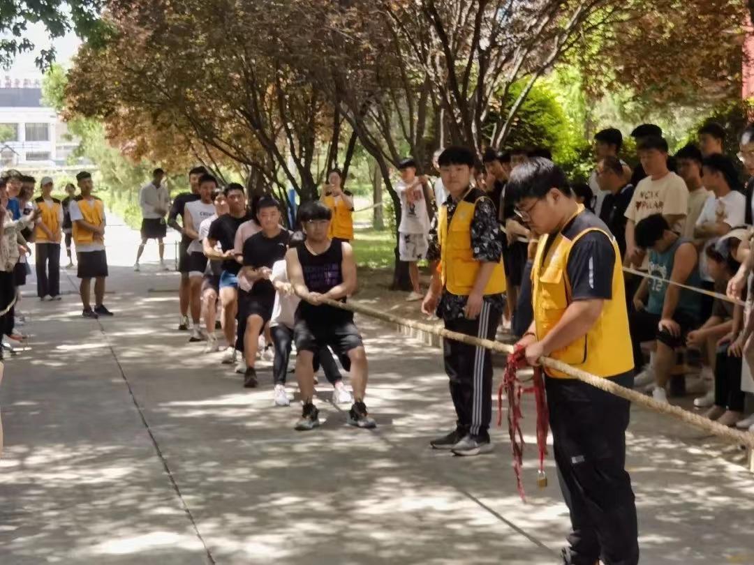 当比赛哨声响起时,参赛同学紧握长绳,都鼓足了劲往后挪动,紧绷的肌肉,发红的脸颊,都鼓足了干劲!同学们个个热情高涨,系部教师旁边助阵加油,一句句“一二,一二,加油!”的响亮口号回荡在上空,哨子声、呐喊声此起彼伏,现场激烈的比赛将整个活动推到了高潮!