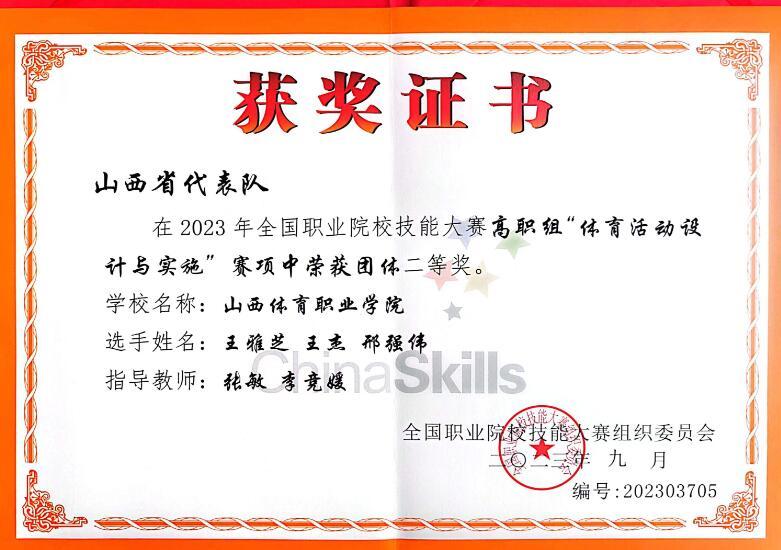 9月22日-25日,2023年全国职业院校技能大赛(高职组)“体育活动设计与实施”赛项在山东省日照职业技术学院举行,来自全国各省市的49所高职院校代表队参加了比赛。我院由体育艺术系教师张敏、李竞媛任指导教师,健身指导专业学生王雅芝、王杰、邢强伟组成代表队参加比赛。参赛师生面对新情况、新问题、新挑战,积极备赛,充分利用假期时间进行集训备赛,团队上下一心,通力合作,经过激烈角逐,荣获大赛二等奖。