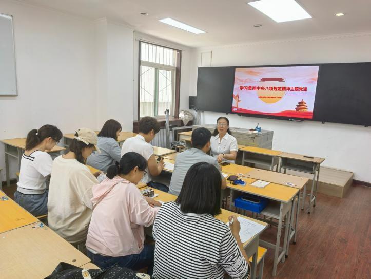 专题党课围绕“学深悟透习近平总书记关于落实中央八项规定精神的系列重要论述和指示要求”“深刻剖析中央八项规定精神历史性作用和关键地位”“结合学院和体育艺术系实际,如何在新时代新征程上持续发力、久久为功,推动中央八项规定精神在学院落地生根”三个维度进行了讲授。