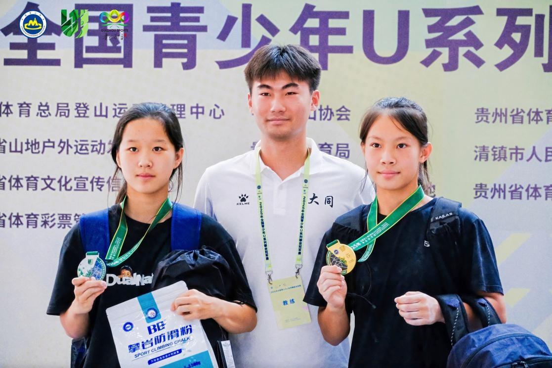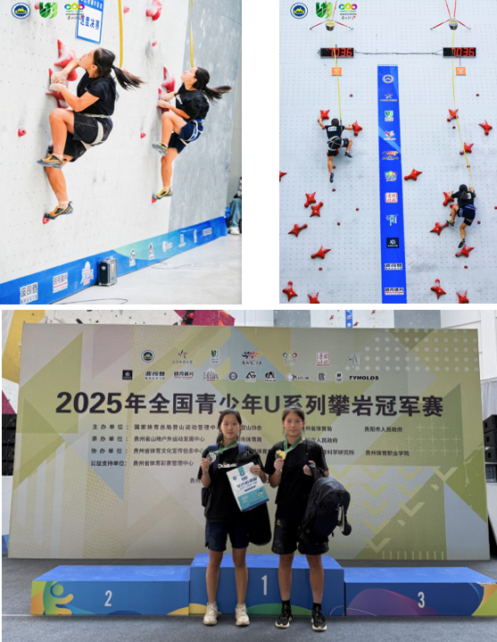 继全国青年攀岩锦标赛收获亚军后,在2025年8月1日至3日贵州举行的全国青少年U系列攀岩冠军赛上,我院攀岩队姐妹花继续良好的竞技状态,成功会师决赛,最终,高煜岚获得速度冠军,王雨晨获得亚军。