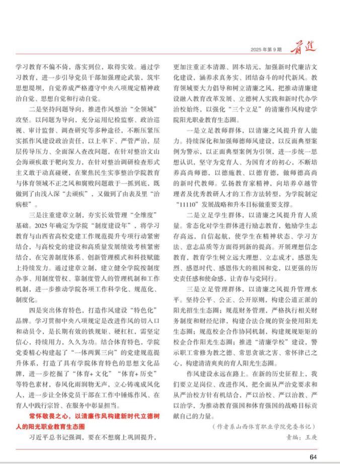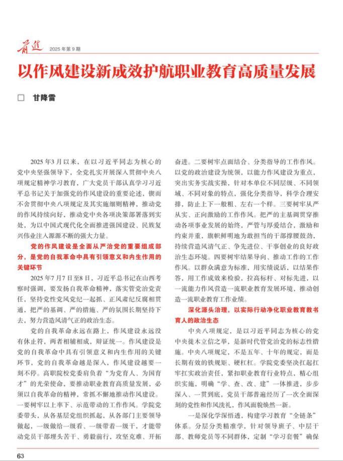 近日,中共山西省委主办的《前进》杂志2025年第9期刊发学院党委书记甘降雷署名文章《以作风建设新成效护航职业教育高质量发展》。