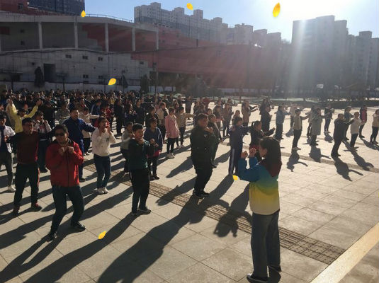 下午四点,特教学校的学生们来到操场整齐列队。由学院学生教授大家第九套广播体操。领操的是来自体育艺术系的三位女同学,他们动作规范,讲解详细,在半个多小时的过程中反复示范,力争将最完美的动作传达给这里的学生们。教学校的学生们都特别积极投入,努力跟着领操的同学做好每一个动作。