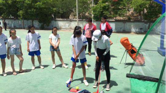 在曹城村小学。爱心企业为孩子们捐赠了体育器材(足球、毽子、跳绳)和学习用品(书包、笔记本、铅笔)等。学院高尔夫专业的老师给孩子们上了一堂生动活泼的体验课,高尔夫专业的学生组织孩子们分组进行了挥杆体验,目的是让孩子们了解高尔夫球运动是一项传授文明礼仪的运动,是一项易于开展的全民健身运动。