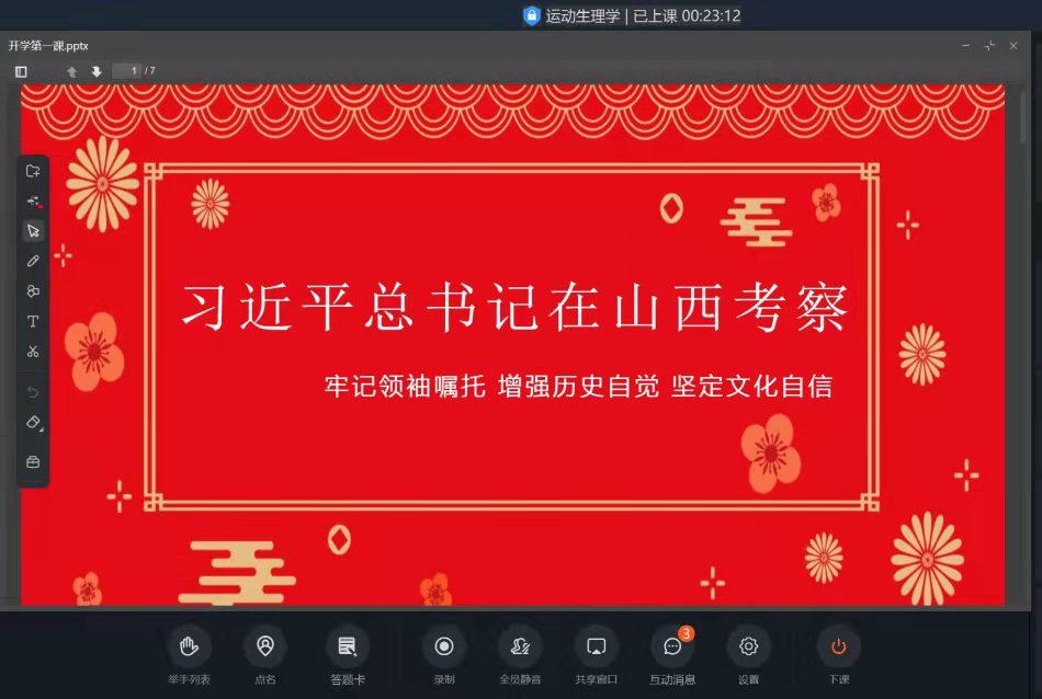 2月28日,学生开始新学期线上教学以来,各代课教师以“一个重点、一个燃点、五个结合”为授课切入点,将思政育人融入专业课程的教学过程中,使学生深刻感悟党的领袖对老区人民的深切关怀,以及党中央对山西工作的高度关注,教育引导学生时刻牢记领袖的殷殷嘱托,努力学习,以更加饱满昂扬的精神状态,投入到学习和训练中。