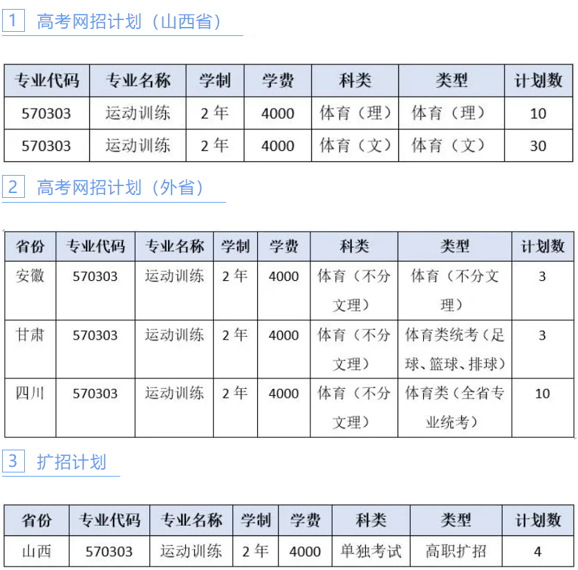 运动训练专业(代码570303,学制:两年),运动训练专业是央财支持的重点专业、山西省高等学校特色专业、山西省高等职业教育骨干专业,并建有山西省高等职业教育示范性实训基地、央财支持实训基地。