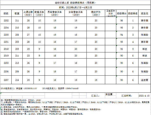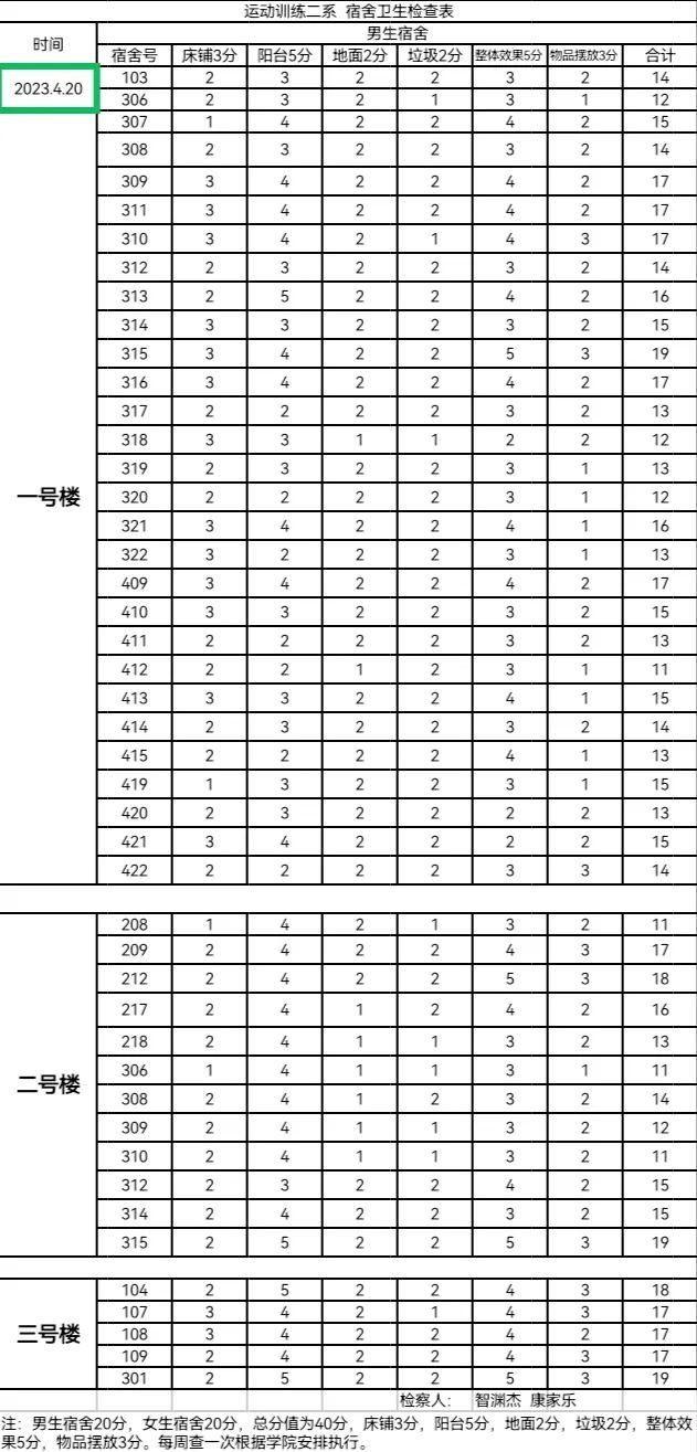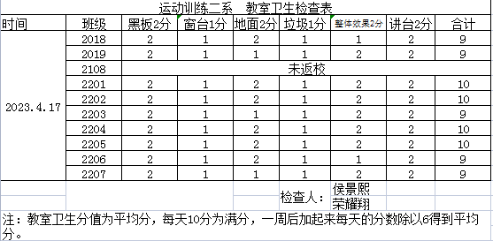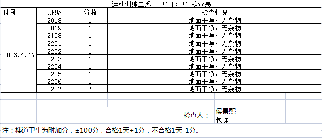 运动训练二系4.17—4.23日卫生检查情况汇总